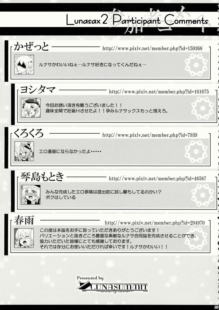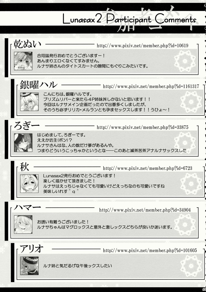 【同人】Lunasax 2 ☆【東方】 2022/1/14(4年前) 登録タグ: 🏷東方 (158), 魂魄妖夢 (11), 同人 (1156), ルナサ・プリズムリバー (5), アンソロジー (32), ✎徐行区間 (かぜっと) (6), ✎かみか堂 (銀曜ハル) (5), ✎241 Inc. (藤伊洵) (5)